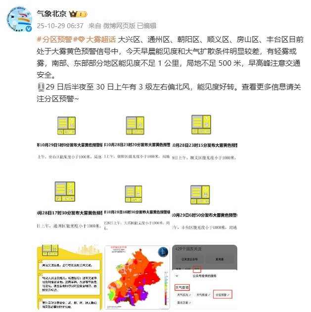 新京报讯 据@meteorologicalbeijing消息,目前大兴区、通州区、朝阳区、顺义区、房山区、丰台区发布大雾黄色预警信号。今晨能见度和大气扩散条件明显较差,有小雾或大雾。南部和东部部分地区能见度不足1公里,部分地区能见度不足500米。早高峰时段注意交通安全。 29日午夜至30日上午,有3级左右偏北风,能见度有所好转。陈艳婷编辑