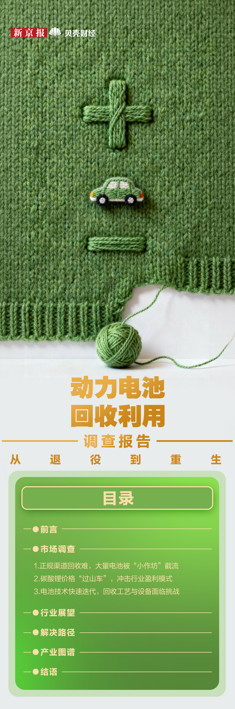 前言随着我国新车产销量连续十年位居世界第一,首批安装在汽车上的大型电动电池正进入报废阶段,千亿回收市场正在加速发展。国家市场监管管理部门公布的数据显示,2024年国内动力电池回收量将突破30万吨,对应市场规模高达480亿元。预计到2030年国内市场规模将突破1000亿元。退役电池并不是“扔掉”,而是根据健康状况分为“梯次利用”和“回收”两条路径。他们继续在能耗稍低的场景中利用余热,或者提取成锂、钴、镍等贵金属原料,返回产业链。堪称一座大“矿井”。了解回收生态新京报贝壳财经推出《动力电池回收调查报告》。尽管市场蓝图令人期待,但当前电池的“回归”仍面临回收渠道混乱、基本金属价格波动、技术变革日新月异、企业盈利困难等诸多挑战。本报告基于对回收行业的采访与调查、对话以及行业数据分析,旨在全面呈现回收行业的现状、困难以及未来的解决方案。 1、市场调研和回收渠道混乱,主要解决三个问题。电池的寿命是多少? True Lithium Research创始人莫柯表示,大多数车企对电动电池提供的质保期为8年或15万公里。在此期间,如果电池容量下降至小于达到额定容量的70%或80%时,制造商负责修理或更换。当电池容量下降到80%以下,不再适合作为车用动力电池时,就已经到了它的“第一次寿命”,这些电池就可以回收利用。新京报贝壳财经记者基于一线走访和多次采访发现,当前电池回收市场主要面临以下三大拥堵点:1、正规渠道回收困难,大量电池被“小作坊”堵塞。调查发现,即使是千亿级的市场正在加速发展,但实际回收过程中却常常出现混乱的情况。正规回收企业普遍面临“不做饭”的困境。大量分散的“小作坊”抢购废旧电池时,报价比正规企业高出10%至15%,造成无序竞争“价格最高的那个”开始流行。中国物资回收协会副会长王德创指出,这种成本轮换的丑陋现象,正规军很难进军回收领域。 2、碳酸锂“过山车”价格正在影响行业营收模式。动力电池回收成本与碳酸锂等金属价格密切相关。回顾2022年底,碳酸锂价格一度走强至60万元/吨的峰值,巨大的利润空间吸引了大量投机者涌入。然而好景不长,其价格随之下跌,2025年上半年跌至7万-8万元/吨区间。调查中,有企业向新京报贝壳记者感叹,市场好的时候回收简直是“抢钱”,但价格跌到低位时,“就赚不到钱”。通过回收和复兴来赚钱。很多人都退缩了。 “华北某网上回收商表示,目前大品牌的回收电池组价格较高,而其他小品牌的回收电池组价格相对较低。这种剧烈的价格波动导致企业库存价值大幅缩水,供应链面临巨大压力。能量密度更高、安全性更好的半固态甚至全固态电池已逐渐进入市场,企业现有的基于电解液电池的淘汰、破碎技术和专用机很可能在不久的将来被淘汰。”帅全球合作伙伴罗兰贝格指出,小作坊暴力拆解不仅容易引发火灾、爆炸,而且导致锂、钴、锰等稀有材料回收不规范。真锂研究柯表示,大量报废电池可能是小作坊随意堆放的,最终的流向是个谜,就像散布在环境中的“定时炸弹”。面对收入困难、渠道混乱等挑战,在政策不断完善、技术不断进步、市场基础稳步扩大的推动下,这个千亿美元的项目显示出火热的发展和巨大的投资潜力。退役电池:梯级利用和回收。余热可用于性能要求稍低的场景,或用于获取贵金属原料并返回产业链。这是千亿规模的业务,也是“城市矿山”的战略发展。路径 1:使用梯队。具体来说,为使容量保持在60%至80%,回收公司将对健康电池进行严格测试、彻底拆解和科学重组,然后应用于低速电动车、市政路灯等场景用于外卖和快递的储能站或电池车。一位电池回收公司的管理人员明确将其比作一盒不新鲜的水果,需要打开并仔细挑选。好果子还是可以用的。这些二次产品的成本通常比新电池低50%左右,并且具有相同的经济和环境价值。途径2:回收。测试过程中容量过低、健康状况不佳的电芯将被送往破碎生产线,通过一系列物理和化学方法进行清洗。镍、钴、锂、锰等贵金属被还原为碳酸锂等电池级原材料,然后出售给电池制造商。例如,邦普行业领先的回收技术可实现镍、钴、锰回收率达99.6%,锂回收率达96.5%。 2、企业生存现状:利润困境与成本痛苦。10月28日,亿纬锂能ESG双碳部总监史长义向新京报贝壳财经记者透露,当前回收行业总体面临投入产值不足的严峻挑战。他坦言:“产品的生产成本长期高于销售价格,导致行业整体处于亏损状态。”这种困境主要是来自两方面的压力:一方面,市场竞争激烈,采购成本高昂;另一方面,市场竞争激烈,采购成本高。另一方面,白名单企业引导作用未能充分发挥,大量废旧电池流向不合规渠道,合规企业难以获得稳定供应。史长义进一步分析了不同商业模式的盈利能力:“目前,利用的名王产业通过拆解电池组、销售拆解电芯,仍有一定的利润空间;”“而回收从废旧电池的收购到成品的生产,尚未实现稳定的盈利。”他表示,环节回收难的主要原因是盈利难,因为废旧电池的获取成本较高,镍、钴、锂等金属价格波动较大。“只有金属价格长期保持稳定,回收过程才能盈利。”这一说法反映了目前回收企业面临的安全压力。 三、产业生态:环环相扣动力电池回收闭环产业链涉及电池资源、回收方及渠道、加工回收方、最终产品及应用等,电池来源主要以比