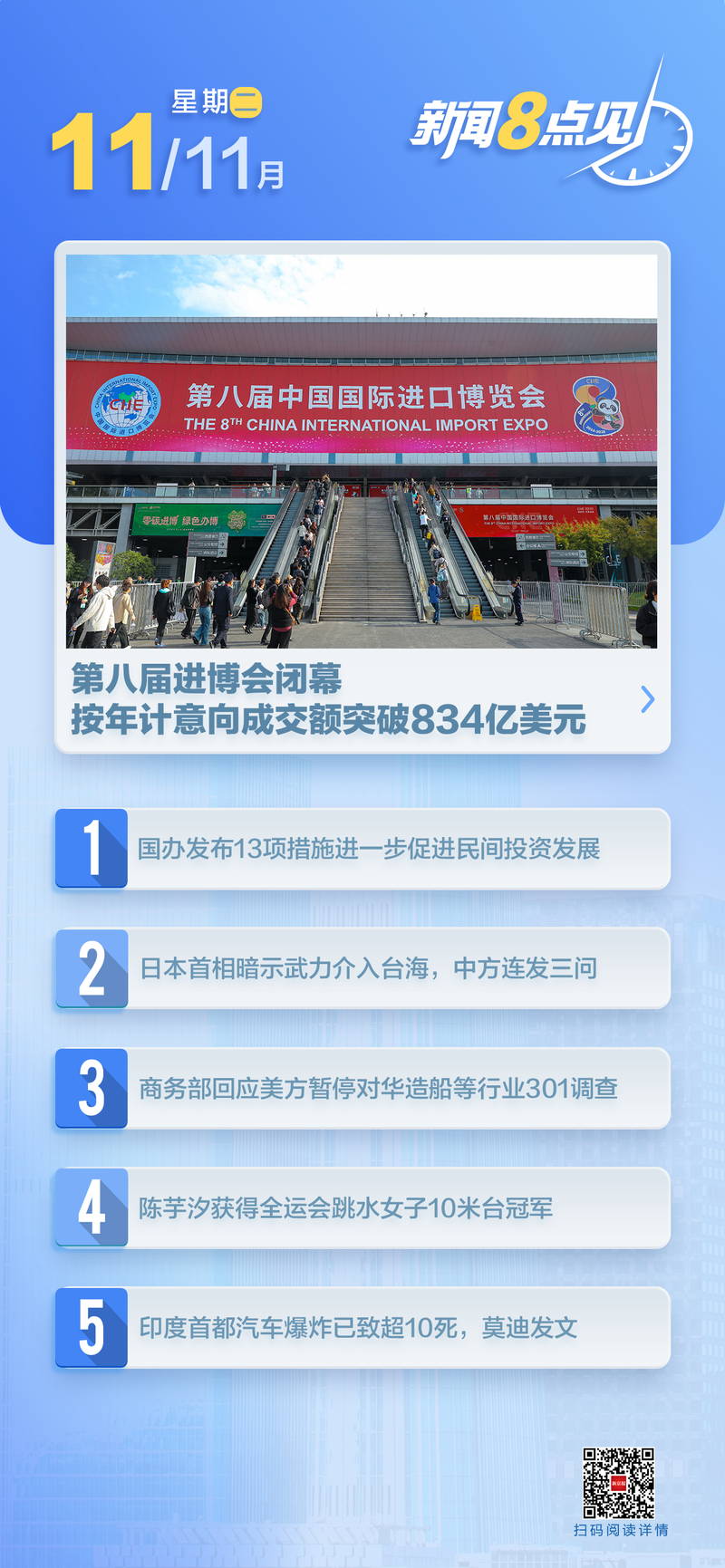 【时事新闻】国务院办公厅印发《进一步促进民间投资发展若干措施》。为进一步激发民间投资活力,促进民间投资发展,国务院办公厅近日印发《进一步促进民间投资发展的若干措施》,提出13项针对性政策措施。 。外交部:性质和影响都很恶劣。林健表示,日本领导人日前在国会公然发表涉台虚假言论,暗示可能武装干预台海,干涉中国内政,严重违反中国原则、中日四个政治文件精神和国际关系基本准则。这与日本政府迄今做出的政治承诺严重不符,其性质和影响极其恶劣。中方对此表示强烈不满和坚决反对,已向日方提出强烈交涉和强烈抗议。台湾是中国的台湾。如何解决台湾问题、实现国家统一纯属中国内政,不容任何外部势力干涉。日本领导人有关表态想向“台独”势力传递什么信号?这是否是企图挑战中国核心利益、阻碍中国统一大业?您想把中日关系引向何方? 。美国暂停对中国造船等行业实施301调查措施。商务部回应:中方注意到美方当地时间11月9日发布公告,宣布暂停对中方实施301调查措施造船等行业自11月10日零时起实施为期一年,具体包括暂停征收其他中国设备的港口费和暂停船岸起重机关税。和其他设备。这是美中相向而行、共同落实中美瓜拉经贸磋商共识的重要一步。同日,中方也暂停实施相关反制措施。中方愿本着相互尊重、平等协商的原则与美方就有关问题进行对话和谈判,期待美方继续同中方对半合作,共同维护国际航运造船市场公平竞争环境,为中美经贸合作和世界经济注入更多确定性和稳定性。 。为进一步完善出口管理易制毒化学品,根据《易制毒化学品向特定国家(地区)出口暂行规定》,商务部、公安部、应急管理部、海关总署、国家食品药品监督管理局决定,以《易制毒化学品向特定国家(地区)出口管理目录》和《特定国家(地区)目录》为宜,新增美国、墨西哥、加拿大《特定国家(地区)目录》中,分别增加了上述三个国家的13种化学前体。因美国暂停对中国海事实施301调查措施,对相关子公司实施一年反制措施,《关于2025年暂停对美五国相关企业采取反制措施的决定》。d 贸易磋商,经国务院同意,自2025年11月10日13时01分起,执行《交通运输部办公厅关于印发美国船舶征收特殊港口费强制措施的公告》(交办税[2025]号...杨小伟严重违反党组织纪律、廉洁纪律构成严重工作违法行为,涉嫌受贿罪,性质严重,影响恶劣,必须按照《中国共产党纪律处分条例》、《中华人民共和国行政法》、《公务员处分法》等有关规定严肃处理。经中央纪律检查委员会常务委员会会议研究,报中共中央批准,决定扩大杨小伟党籍;国家行政委员会给予开除公职处分;没收其非法所得;将其涉嫌犯罪问题移送检察院依法侦查起诉,并移送涉案财物。 。国家林业和草原局原党组成员、副局长李春良被开除党籍。国内成品油零售价格今年以来第七次上涨,近期国际市场92号汽油每升上涨0.1元。石油市场价格波动。根据11月10日前10个工作日均价与前10个工作日均价对比10月27日起,按照现行成品油价格机制,11月10日24:00起,国内汽油、柴油价格(标准品,下同)每吨分别上涨125元、12元。折算成涨价幅度,92号汽油、95号燃油、0号柴油每升涨价均为0.10元。今年以来,国内成品油零售价格经历了22次调整周期,其中7次上涨、6次搁浅、9次下跌。 。近日,北京市公安交管部门发布公告,公布一批固定式交通技术监控设备。目前,北京153条道路已增设359个“电子警察”,专门监控禁止限行、违反标志标线、闯红灯、货车转弯必须停车、斑马线不让行、开车不系安全带、谈话等违法行为。开车时打电话。其中,在133条道路上新增了329个探头,专门用于抓违章停车。 。 10月份,北京居民消费价格环比扩大,由下降转为同比上涨。从环比看,CPI上涨0.4%,涨幅比上月扩大0.3个百分点。其中,食品价格上涨0.9%,涨幅比上月回落1.3个百分点,影响CPI涨幅近0.12个百分点。从同比看,CPI上涨0.1%,上月下降0.6%。其中,食品价格下降3.2%,降幅比上月收窄2.5个百分点。 。医院回应:这是由于记录保存不善而出现的笔误。 11月10日,有媒体发布《三个月大女儿出院记录是“男婴”?》疑似生下婴儿的女子”相关报道称,这位母亲在产房里生下了孩子。妈妈和宝宝同时出生,只生了一个宝宝,没有出现任何处理不当的情况。对此我们深表歉意。陪审团成员“与首次参加质证的法官姓名相对应。11月10日下午,二审法院(即锡林郭勒盟中级人民法院)一名工作人员告诉新京报记者,他们收到了有关此事的评论,需要核实是否真的是同一人。“如果是同一人,肯定可以确定,不涉及同一名法官。” 10日晚,上诉人赵女士告诉记者,法院确认两人为同一人,并将于11月10日在国家会展中心(上海)举行闭幕新闻发布会。据中国国际进口博览局组委会、副局长介绍,进博会企业展出面积超过36.7万平方米,共有来自138个国家和地区的4108家企业参展。展览面积和企业数量均创历史新高。其中,世界500强企业和龙头工业企业有290家,180家企业成为“第八届全日制学员”,充分体现了中国超大规模的强大“磁力吸引力”。本届进博会成交活跃,全年意向成交额达834.9亿美元,比上届增长4.4%,创历史新高。 。近日,市场监管总局针对各大电商平台发布“双十一”网上集中促销合规提示,旨在规范促销操作,维护“双十一”期间网络交