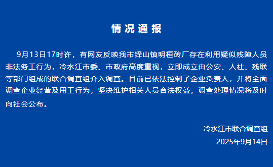 北京新闻于9月14日,伦格简·城市的联合调查小组发布了有关情况的报告,以及以下内容:9月13日左右,一些网民报告说,一些网民报告说,我们城市的Minghuan Brick Factory在我们的城市进行了非法活动,该活动是使用残疾人的非法活动。 Lengshuijiang市政党委员会和市政政府非常重视它,并立即建立了一个联合调查小组,该组织由公共安全,人力资源和社会保障,残疾人和其他部门组成,以介入调查。目前,负责业务的人是根据法律控制的,将对工作的运营和行为进行全面调查,而不会阻止那些人的合法权利和利益,并且将及时宣布对局势的调查和处理。编辑Mao Tianyu