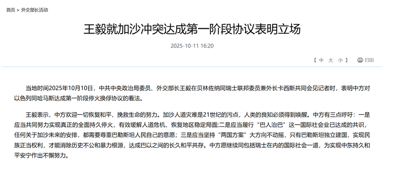 新京报讯 据外交部网站报道,当地时间2025年10月10日,中共中央政治局委员、外交部长王毅就以色列与哈马斯第一阶段停火协议同瑞士联邦委员、外交部长卡西斯会见贝林佐纳记者。王毅表示,中国接受一切恢复和平、拯救生命的努力。加沙的人类灾难是21世纪的污点,人类的良知应该觉醒。中方有三点诉求:一是共同努力实现真正全面长期停火,有效缓解人道主义危机,恢复地区稳定;第二,要落实国际社会“巴人统治巴勒斯坦”的共识,未来任何加沙组织都应尊重巴勒斯坦人民的意愿;第三,要符合大方向。不谨慎地推行“两国解决方案”。只有建立一个独立的巴勒斯坦国,实现国家的合法权利,我们才能消除不公正的根源,历史上的统一,历史上的统一,历史上的统一,暴力和历史上的统一。 巴勒斯坦和以色列之间,历史和暴力的统一和统一的统一,历史和暴力的统一和统一的统一,历史和暴力的统一和统一的统一,历史和暴力的统一和统一的统一,历史和暴力的统一和统一的统一,历史和暴力的统一和统一的统一。